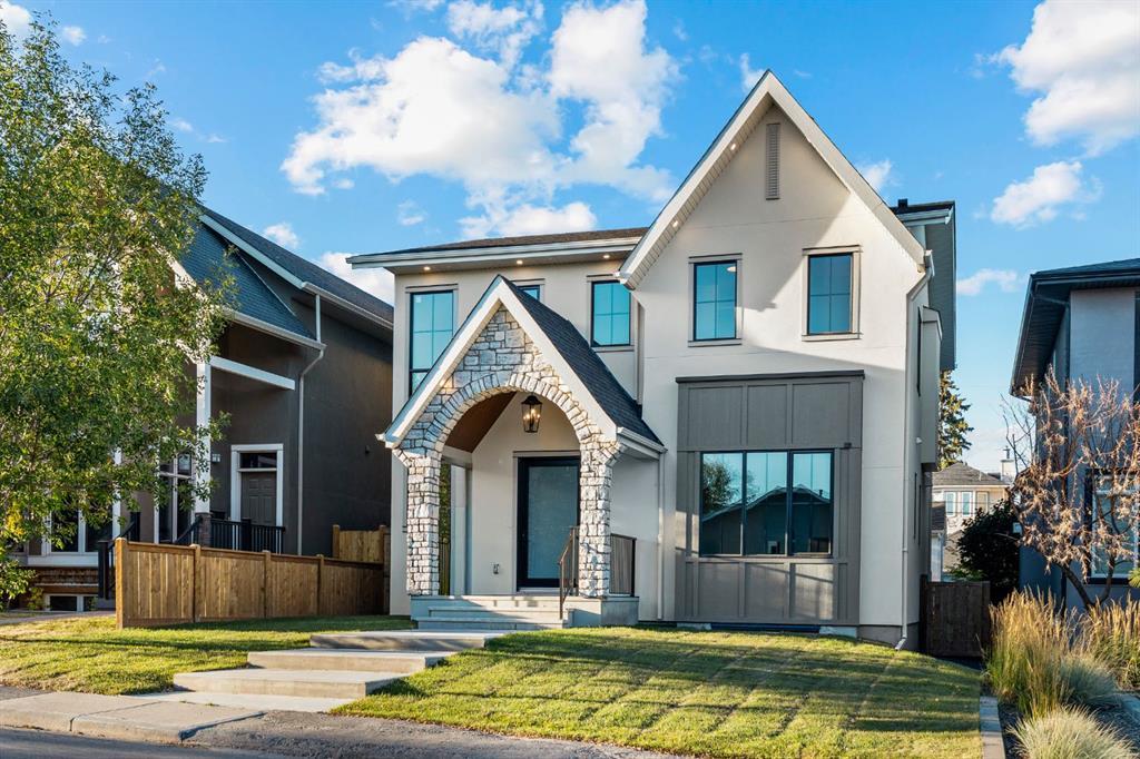 Welcome to The Bardot, an architectural masterpiece that seamlessly blends French cottage elegance with modern luxury in Calgary’s highly desirable Marda Loop. Thoughtfully crafted by Cedar Rock Homes and curated by Aly Velji Designs, this bespoke residence offers four bedrooms, 4.5 bathrooms, and a triple-car garage. The exterior showcases a stunning fusion of stone, stucco, and Hardie panel, paired with an aluminum cedar soffit entry, custom aluminum Lux windows, and a striking front entry door. A private backyard enhances the tranquility of the large composite patio with aluminum glass railing, while the fully landscaped and fenced yard ensures low-maintenance outdoor enjoyment. Inside, 10’ ceilings on the main level and 9’ ceilings on the upper and lower floors create a sense of volume and sophistication. The wide plank white oak engineered hardwood flooring extends across all floors, all solid core doors, accentuated by custom site-built cabinetry with maple dovetail drawers and Blum hinges throughout. The heart of the home is the gourmet kitchen, appointed with a premium JennAir appliance package including a 48” gas range, 48” panelled refrigerator, panel-ready dishwasher, and an island microwave drawer. A curved quartz slab island, custom cabinetry, and a sculptural hood fan set the tone for a refined culinary space. A butler’s pantry with extended storage and designer lighting and plumbing fixtures, including Brizo and Delta finishes, enhances functionality and style, while the spacious dining room features a custom oak sideboard, functional spaces like the large mudroom, adorned with bespoke millwork. A cozy gas fireplace anchors the main floor living room, while the foyer leads to a beautifully designed home office complete with custom cabinetry with glass doors, French doors, and floor plugs. Upstairs, three bedrooms each offer their own walk-in closets and all ensuites with heated tile flooring. The luxurious primary suite features a vaulted ceiling and a spa-inspired ensuite with an oversized steam shower (two rain heads, and hand bar), a freestanding tub, solid slab stone backsplash, and custom hanging metal mirrors. A dedicated laundry room with washer, dryer, sink, rod, and cabinetry completes the upper level. The finished basement offers additional entertaining and lifestyle spaces with a gym room, TV/game area, a full bathroom, a wet bar with beverage fridge, and generous storage. Mechanically, the home is equipped with dual-zone 96% efficient furnaces with humidifiers, a heat recovery ventilator, automatic water shut-off valve, and rough-ins for in-floor basement heating, air conditioning, vacuum flow, speakers, a security system, and exterior cameras. Every inch of The Bardot speaks to quality, comfort, and timeless beauty. Located in a quiet pocket of Marda Loop just steps from trendy boutiques, restaurants, dog parks, schools, and minutes from downtown, this home is the perfect harmony of prestige and practicality. Book your showing today!